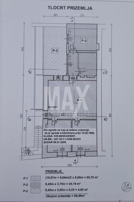 Dokumentacija:vlasnički list,Rješenje o izvedenom stanju,Rješenje da je građevina građena prije 1968.godine.
