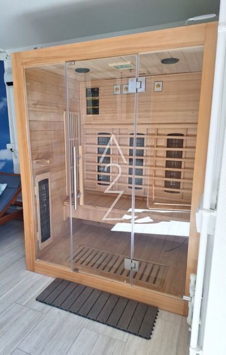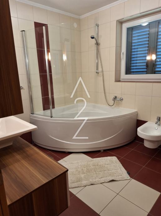 Vanjski dio kuće je podjednako impresivan kao i sama kuća. Ispred se nalaze čak 2 iznimno velike natkrivene terase, grijani bazen sa sunčalištem, zaseban prostor sa saunom, jacuzzijem i sanitarnim čvorom, uređeno dječje igralište, prostrana zelena površina unaokolo kuće te pomoćna zgrada, također legalizirana, gdje su smješteni garaža, sanitarni čvor i na katu kompletno opremljen stan s jednom spavaćom sobom. Apartman se sastoji od još jedne kuhinje, blagovaonice, boravka, spavaće sobe, kupaonice i zasebne vanjske terase.