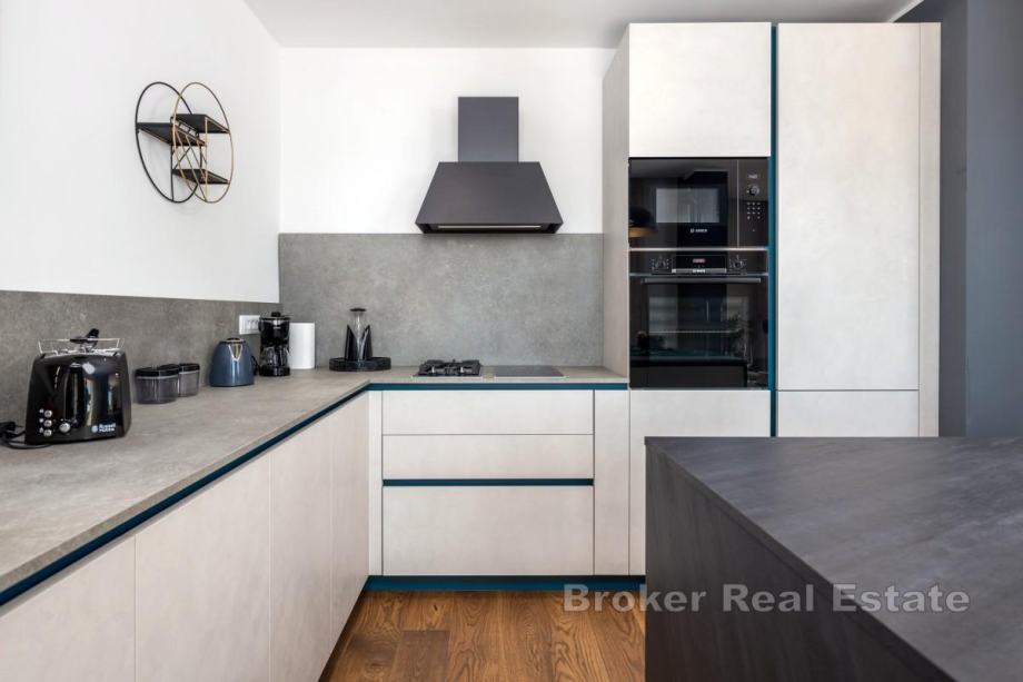 Prizemlje: jednosobni stan s dnevnim boravkom, povezan s velikom terasom i ljetnom kuhinjom, idealno za društvena okupljanja.
