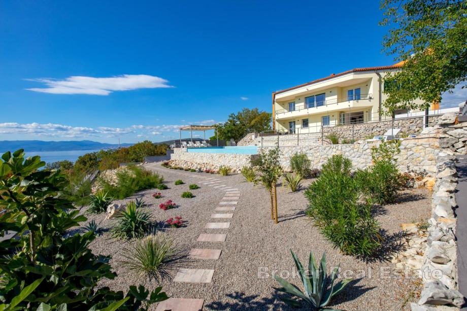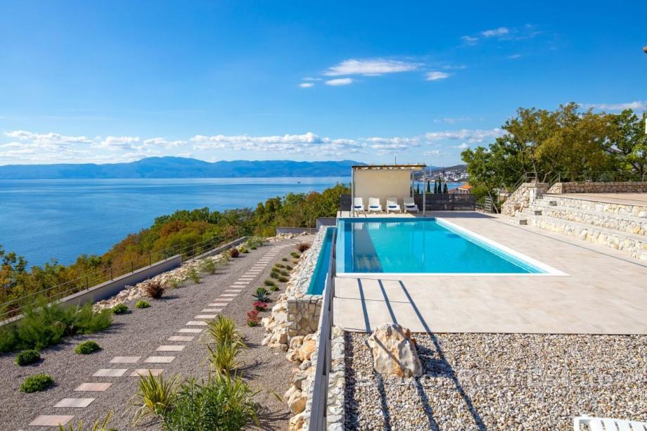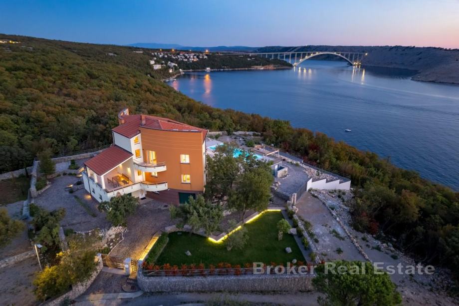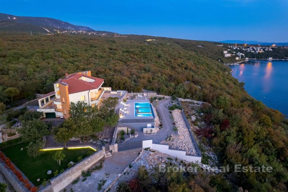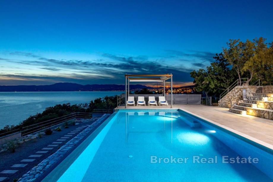 Smještena u prvom redu do mora, odmah preko 80 metara široke zelene zone, ova veličanstvena vila nudi privilegiran položaj sa spektakularnim pogledom na Kvarnerski zaljev, otok Krk i znameniti Krčki most.