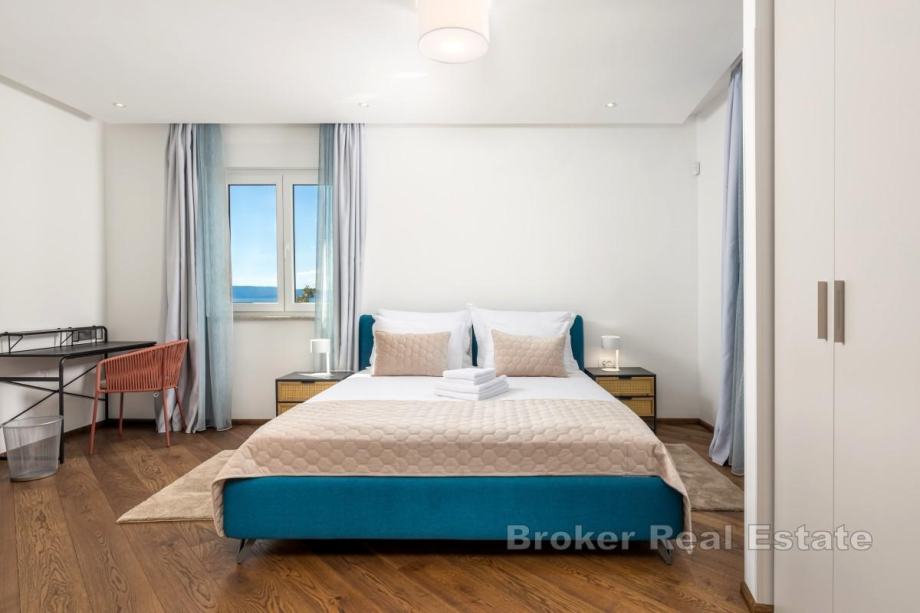 Prvi kat: prostrani trosobni stan s dnevnim boravkom, kupaonicom i nekoliko terasa s panoramskim pogledom na more.