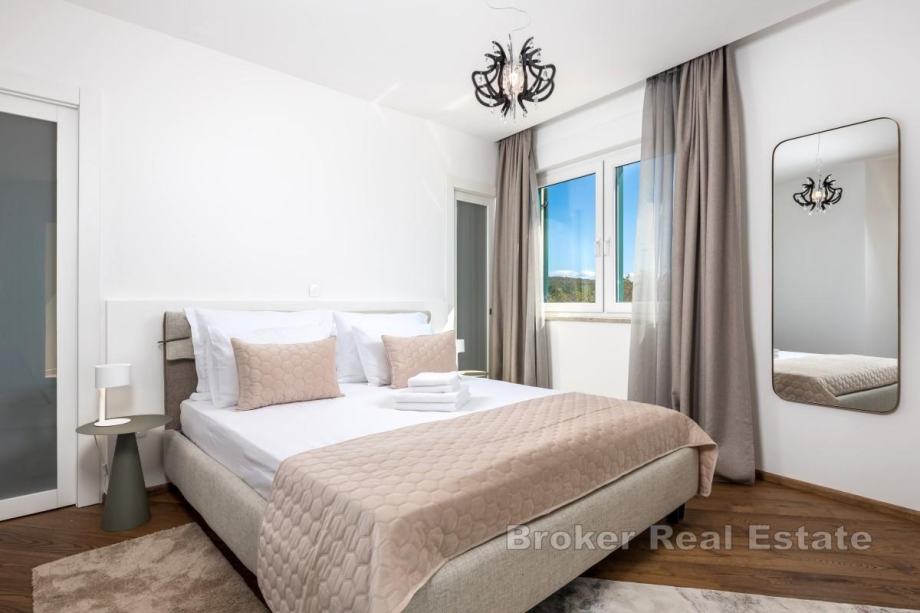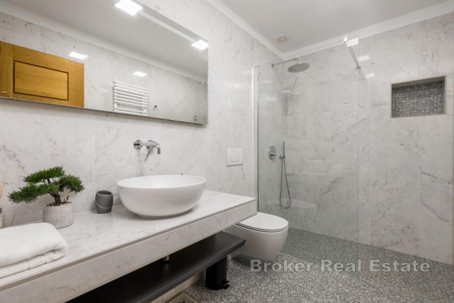 Vila se prostire na 463 m² i temeljito je renovirana 2022. godine, kombinirajući modernu udobnost s mediteranskom elegancijom. Organizirana je u tri neovisna stana, pružajući privatnost i svestranost, idealna za obiteljski život ili kao investiciju za najam.