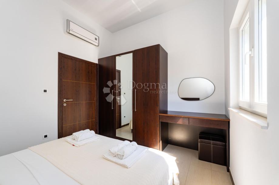 Naime, vila se prostire kroz tri elegantno uređene i potpuno opremljene zasebne jedinice s ukupno 5 spavaćih soba i 5 kupaonica, čime nudi savršenu kombinaciju intimnosti i prostora za obitelj ili prijatelje. Uživajte u rustikalnom šarmu kamina u dnevnom boravku, gurmanskim trenucima u potpuno opremljenoj kuhinji i neprekidnim panoramskim pogledima na Jadransko more s velike terase.