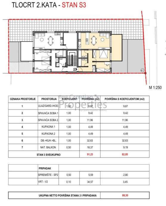 Ukupna površina stana sa vrtom (34,57 m2 sa koeficijentom= 3,45m2) i GPM te spremištem (5.59m2 sa koeficijentom= 2,80 m2) sa koeficijentima ispada 95.63m2.