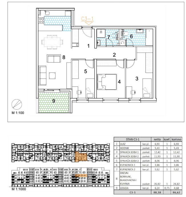 Četverosoban stan površine 86,62 m2 smješten na 3. katu.Stan C3-1 sastoji se od ulaza, hodnika, 3 spavaće sobe, 2 kupaonice, dnevnog boravka, kuhinje s blagovaonicom, loggije.Velika Gorica, projekt stambene novogradnje namijenjen stalnom stanovanju, koji obuhvaća 91 stambenu jedinicu. U sklopu...