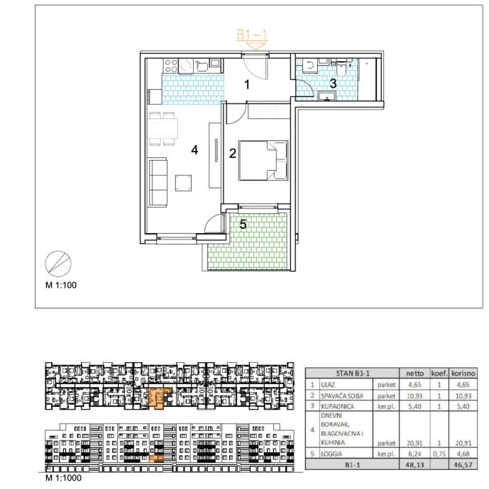 Dvosoban stan površine 46,57 m2 smješten na 1. katu.Stan B1-1 sastoji se od ulaza, spavaće sobe, kupaonice, kuhinje s blagovaonicom, dnevnog boravka te loggije.Velika Gorica, projekt stambene novogradnje namijenjen stalnom stanovanju, koji obuhvaća 91 stambenu jedinicu. U sklopu zgrade...