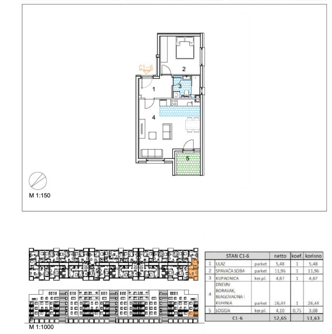Dvosoban stan površine 51,63 m2 smješten na 1. katu.Stan C1-6 sastoji se od ulaza, spavaće sobe, kupaonice, dnevnog boravka, kuhinje s blagovaonicom te loggije.Velika Gorica, projekt stambene novogradnje namijenjen stalnom stanovanju, koji obuhvaća 91 stambenu jedinicu. U sklopu zgrade...