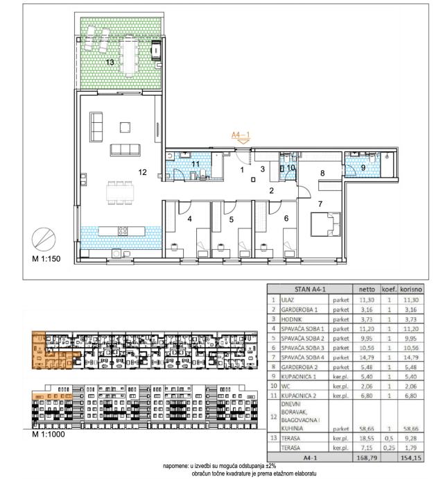 Five-room apartment of 154.15 m2 located on the 4th floor.Apartment A4-1 consists of an entrance, 2 wardrobes, hallway, 4 bedrooms, 2 bathrooms, guest toilet, living room, kitchen with dining room and 2 terraces.Velika Gorica, a new residential building project intended for permanent residence,...