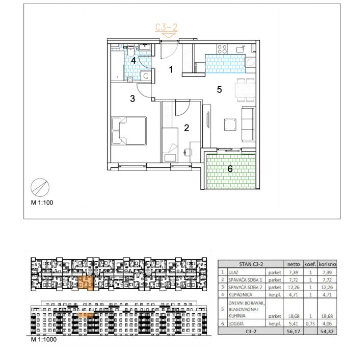Three-room apartment of 54,82 m2 located on the 3rd floor.Apartment C3-2 consists of an entrance, 2 bedrooms, bathroom, living room, kitchen with dining room and loggia.Velika Gorica, a new residential building project intended for permanent residence, which includes 91 residential units. The...