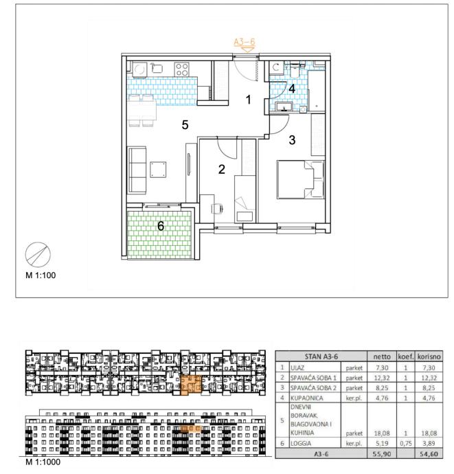 Three-room apartment of 54,60 m2 located on the 3rd floor.Apartment A3-6 consists of an entrance, 2 bedrooms, bathroom, living room, kitchen with dining room and loggia.Velika Gorica, a new residential building project intended for permanent residence, which includes 91 residential units. The...