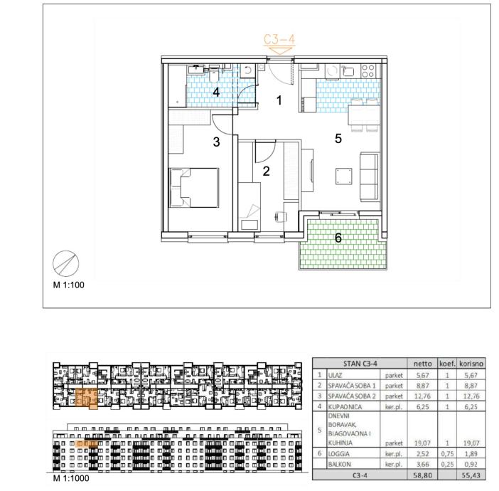 Three-room apartment of 55,43 m2 located on the 3rd floor.Apartment C3-4 consists of an entrance, 2 bedrooms, bathroom, living room, kitchen with dining room, a balcony and loggia.Velika Gorica, a new residential building project intended for permanent residence, which includes 91 residential...