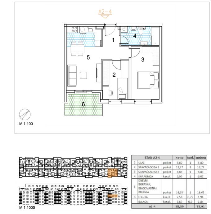 Two-bedroom apartment with an area of 55,91 m2 located on the 2nd floor.Apartment A2-4 consists of an entrance, 2 bedrooms, bathroom, kitchen with a dining room, living room, a balcony and a loggia.Velika Gorica, a new residential building project intended for permanent residence, which includes 91...