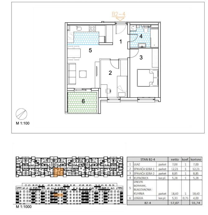 Trosoban stan površine 55,74 m2 smješten na 2. katu.Stan B2-4 sastoji se od ulaza, 2 spavaće sobe, kupaonice, dnevnog boravka, kuhinje s blagovaonicom te loggije.Velika Gorica, projekt stambene novogradnje namijenjen stalnom stanovanju, koji obuhvaća 91 stambenu jedinicu. U sklopu zgrade...