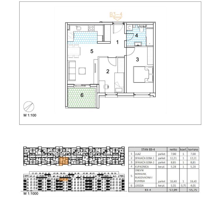 Three-room apartment of 55,75 m2 located on the 3rd floor.Apartment B3-4 consists of an entrance, 2 bedrooms, bathroom, living room, kitchen with dining room and loggia.Velika Gorica, a new residential building project intended for permanent residence, which includes 91 residential units. The...