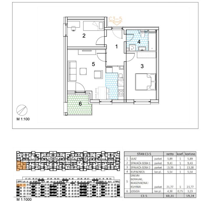 Trosoban stan površine 59,24 m2 smješten na 3. katu.Stan C3-5 sastoji se od ulaza, 2 spavaće sobe, kupaonice, dnevnog boravka, kuhinje s blagovaonicom te loggije.Velika Gorica, projekt stambene novogradnje namijenjen stalnom stanovanju, koji obuhvaća 91 stambenu jedinicu. U sklopu zgrade...