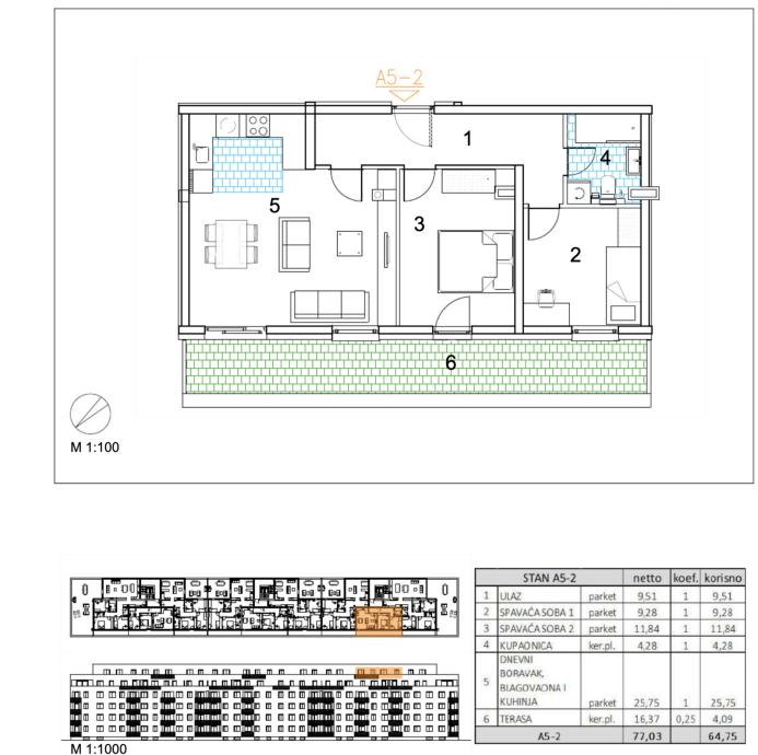 Trosoban stan površine 64,75 m2 smješten na 5. katu.Stan A5-2 sastoji se od ulaza, 2 spavaće sobe, kupaonice, dnevnog boravka, kuhinje s blagovaonicom te terase.Velika Gorica, projekt stambene novogradnje namijenjen stalnom stanovanju, koji obuhvaća 91 stambenu jedinicu. U sklopu zgrade...