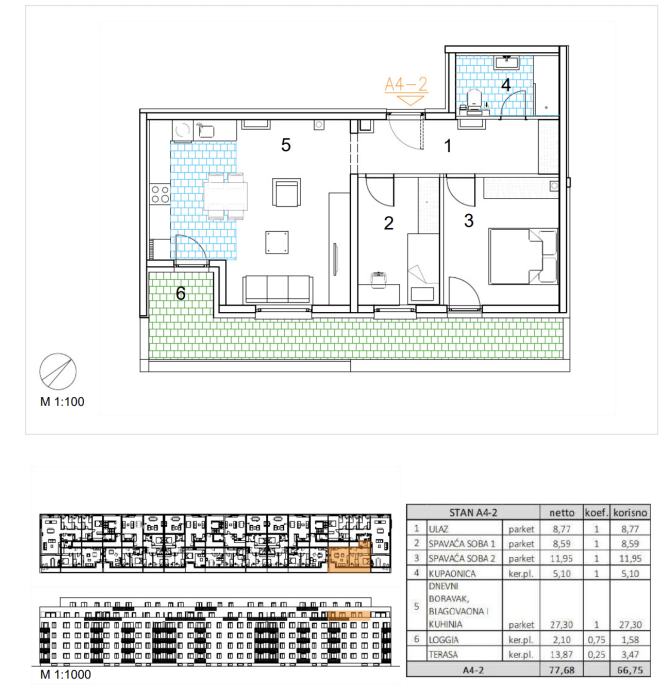 Trosoban stan površine 66,75 m2 smješten na 4. katu.Stan A4-2 sastoji se od ulaza, 2 spavaće sobe, kupaonice, dnevnog boravka, kuhinje s blagovaonicom, terase te loggije.Velika Gorica, projekt stambene novogradnje namijenjen stalnom stanovanju, koji obuhvaća 91 stambenu jedinicu. U sklopu...