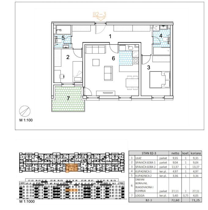 Trosoban stan površine 71,25 m2 smješten na 2. katu.Stan B2-3 sastoji se od ulaza, 2 spavaće sobe, 2 kupaonice, dnevnog boravka, kuhinje s blagovaonicom te loggije.Velika Gorica, projekt stambene novogradnje namijenjen stalnom stanovanju, koji obuhvaća 91 stambenu jedinicu. U sklopu zgrade...