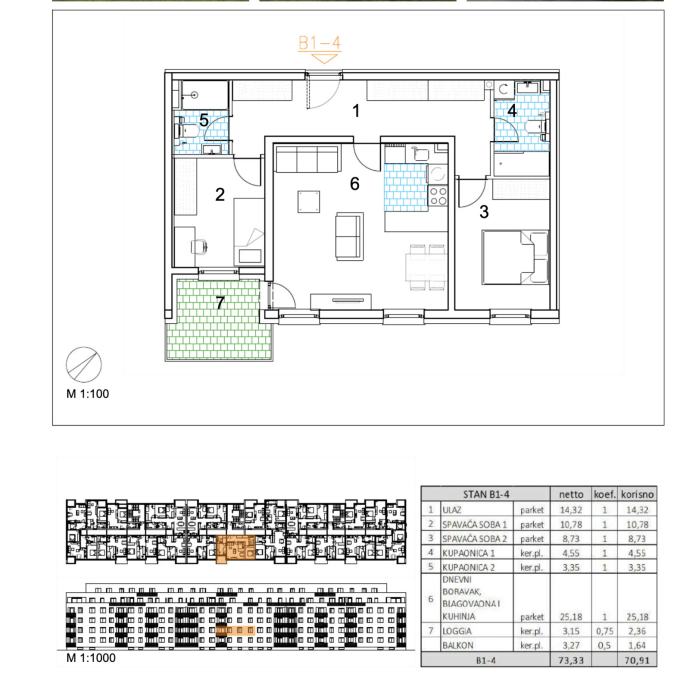 Trosoban stan površine 73,33 m2 smješten na 1. katu.Stan B1-4 sastoji se od ulaza, 2 spavaće sobe, 2 kupaonice, dnevnog boravka, kuhinje s blagovaonicom, balkona te loggije.Velika Gorica, projekt stambene novogradnje namijenjen stalnom stanovanju, koji obuhvaća 91 stambenu jedinicu. U sklopu...