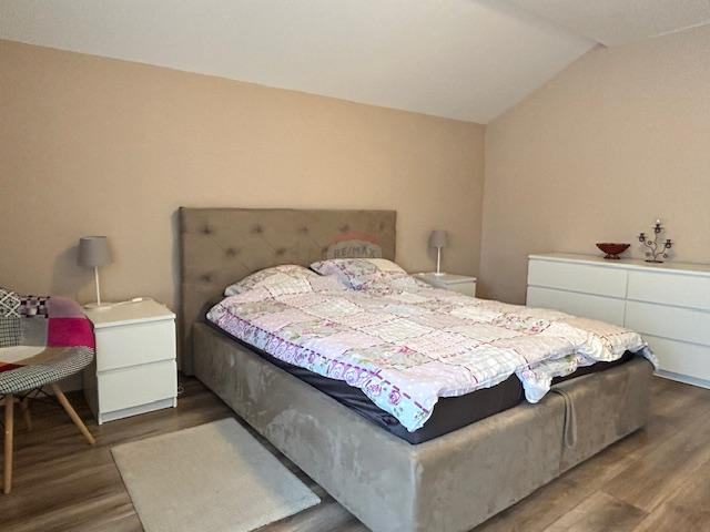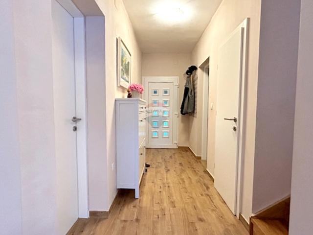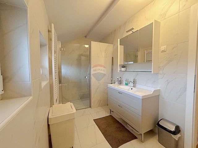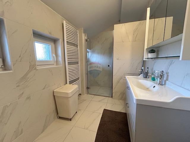 Kuća ima funkcionalan i moderan raspored sa 220m2 stambenog prostora. U prizemlju se nalaze kuhinja, blagovaonica, dnevni boravak i jedna spavaća soba, dok su na katu tri prostrane spavaće sobe i moderna kupaonica. Kupaonice su opremljene kvalitetnom keramikom i modernim walk-in tušem, pružajući dojam luksuza.