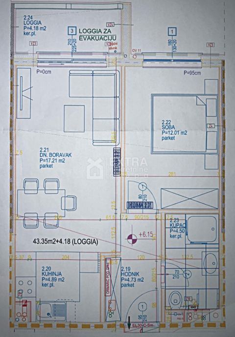 Stan ima 43,35 m2 + lođa površine 4,18 m2 (obračunato po koeficijentu 0,75 je 3,14 m2), što znači da je ukupna površina stana 46,49 m2.