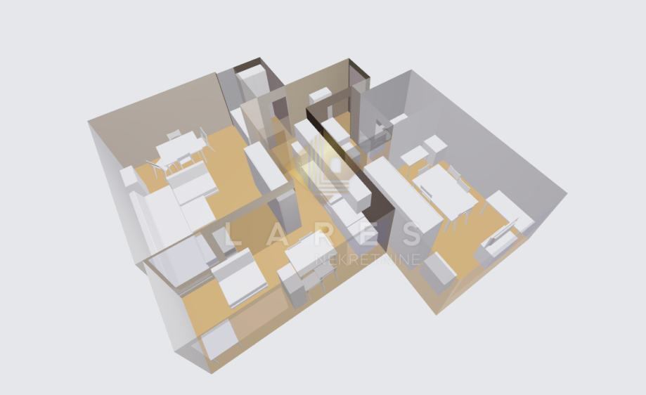 Stan je jugoistočne orijentacije, pružajući obilje prirodne svjetlosti tijekom cijelog dana. Sastoji se od ulaznog hodnika, dvije spavaće sobe, kupaonice, izbe, kuhinje s blagovaonicom i dnevnog boravka. Osim toga, stanu pripada i drvarnica u podrumu zgrade, pružajući dodatni prostor za pohranu.