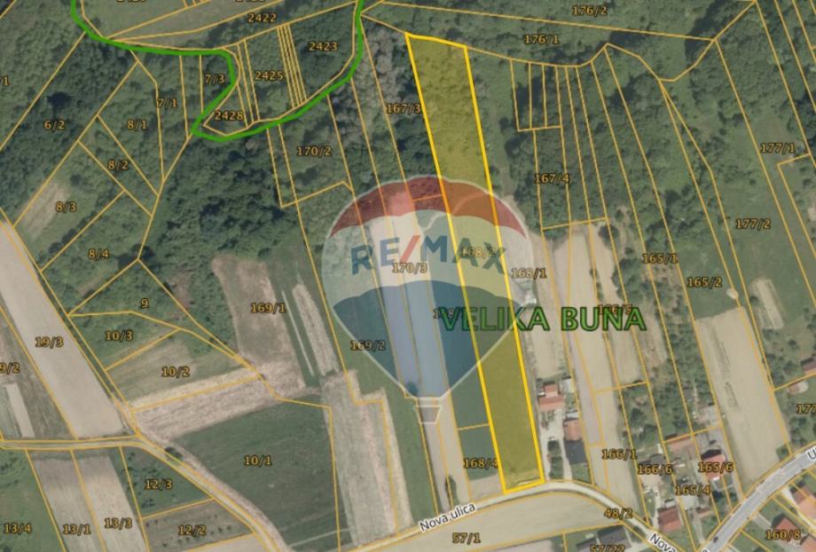 Na prodaju je zemljište ukupne površine 7.268 m², smješteno u naselju Velika Buna, Velika Gorica Okolica. Parcela se nalazi u mirnoj sporednoj ulici, a ujedno u neposrednoj blizini glavne prometnice, što osigurava spoj privatnosti i dostupnosti. Otprilike 60 metara zemljišta nalazi se unutar građevinskog područja, dok je preostali dio poljoprivredne namjene (P3 ostala obradiva tla).