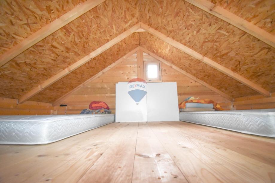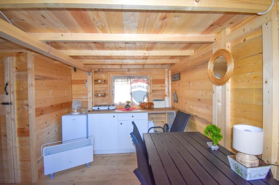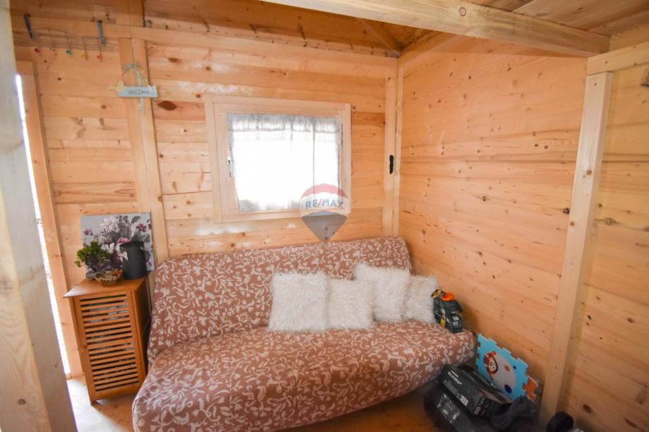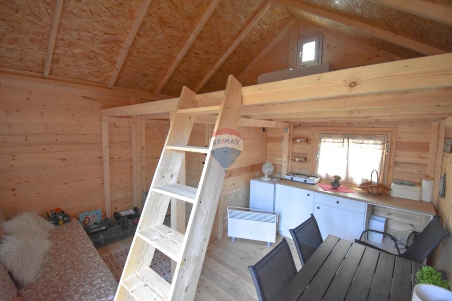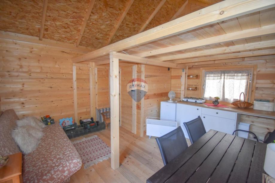 Na zemljištu se nalazi privremeni objekt veličine 16 m2, opremljen namještajem, spremnikom za vodu, kemijskim toaletom, solarima, sve staro manje od godinu dana (uračunato u oglašenu cijenu).