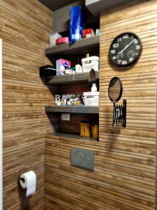 Kat se sastoji od hodnika, open space dnevnog boravka sa kuhinjom i blagovaonom te izlazom na balkon, 2 spavaće sobe također s izlazom na balkon i kupaonice s toaletom.