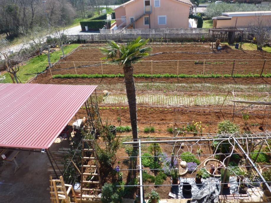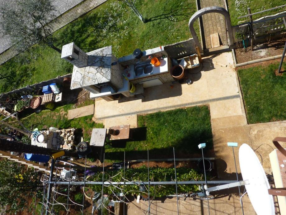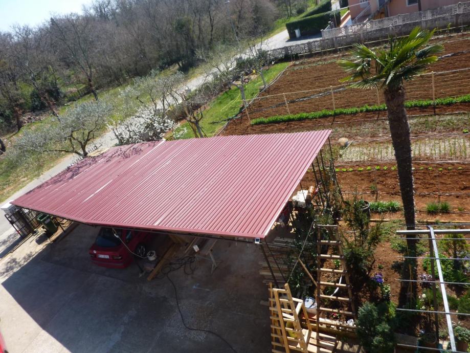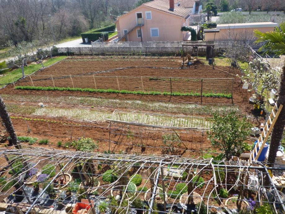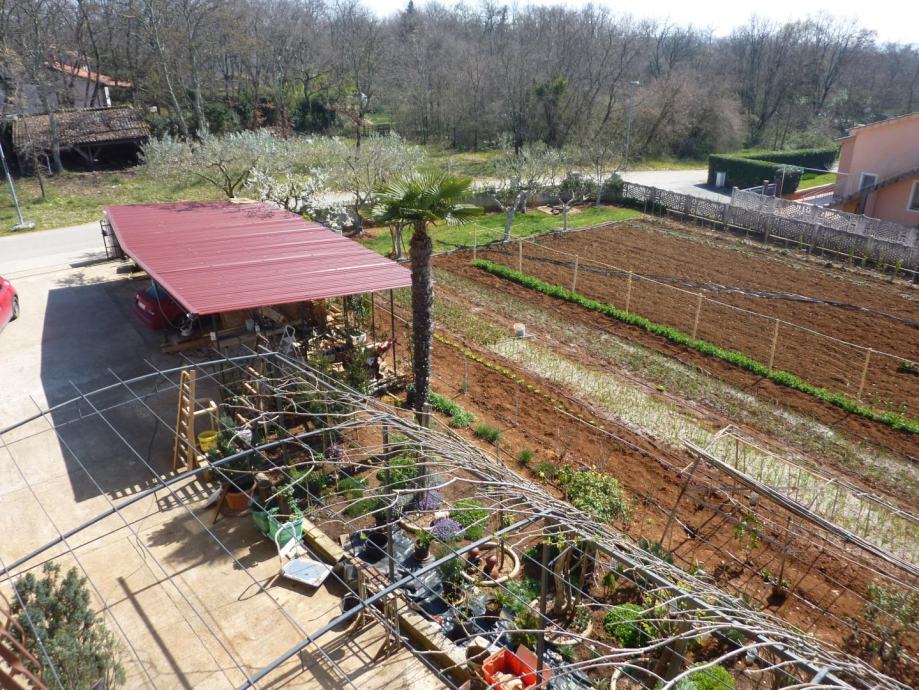 Parcela oko kuće veličine je 1408m2 kvadratnih i opremlejna je vanjskim kaminom sa roštiljem i sudoperom, vanjskim kamenim stolom i natkrivenim parkirnim mjestima. Na samoj parceli zasađen je i ekološki vrt sa raznim vrstama povrča i stablima voća.