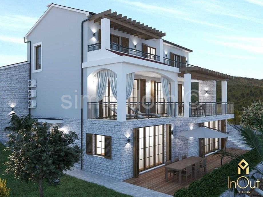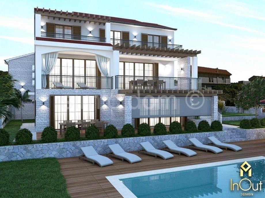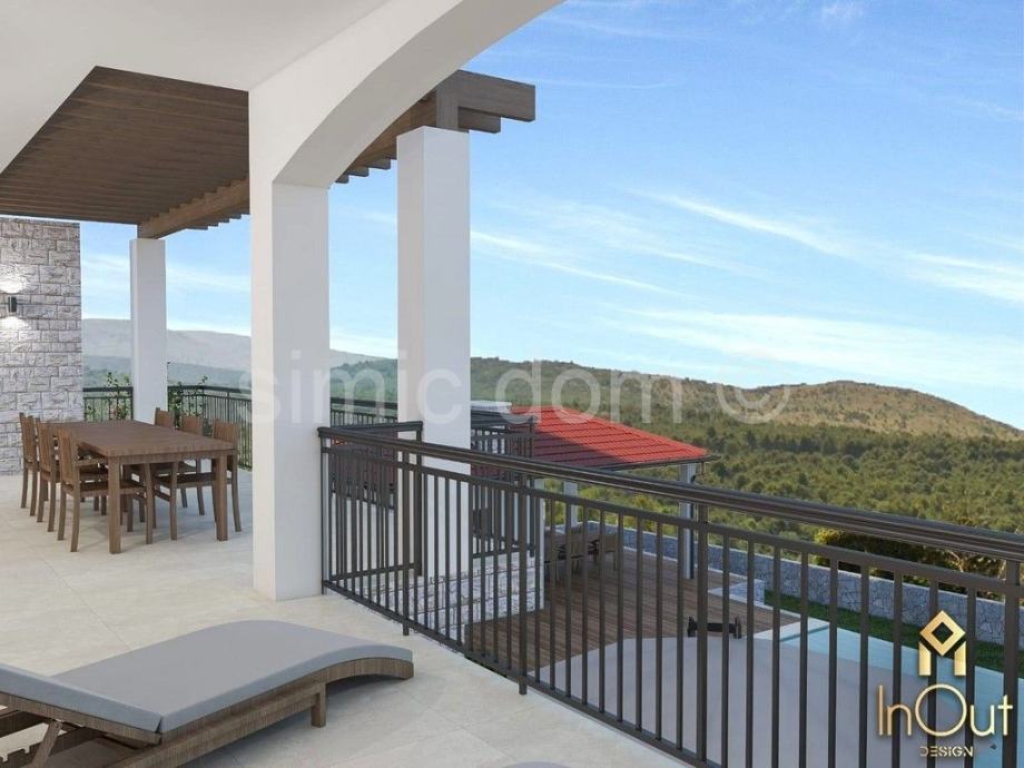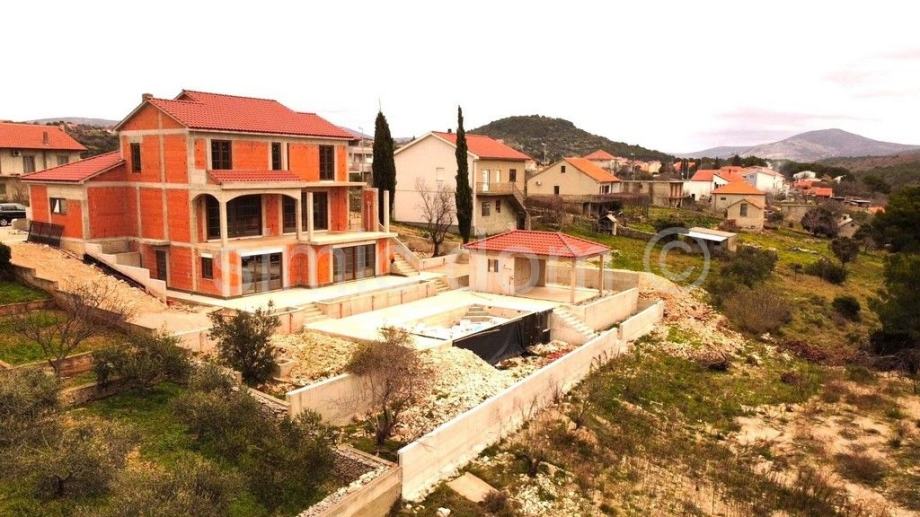 Na prodaju je nedovršena obiteljska kuća sa bazenom smještena u Vrpolju, mirnom mjestu udaljenom 5 minuta vožnje od Šibenika, a do najbliže plaže ima 5km. Kuća je smještena na velikoj parceli od preko 1000m2 te ima neto korisnu površinu od 376m2 koji se protežu na tri etaže. Suteren ima115.91m2 površine i sastoji se od hodnika, 2 ostave, kupaonice, konobe, a na ovoj razini su još 4 dodatne prostorije odnosno dodatna spremišta, a jedno može biti korišteno i kao dodatna spavaća soba. Tu je i ljetna kuhinja sa velikim staklenim stijenama. Prizemlje površine 152.91m2 sastoji se od garaže za dva automobila, wc-a, 2 ostave, dnevnog boravka zajedno sa kuhinjom i blagovaonicom iz koje se izlazi na predivnu terasu sa pogledom na brda i prelijepu prirodu. Na prvom katu površine 107.13m2 nalazi se hodnik, 3 spavaće sobe, 2 kupaonice, garderoba, praonica te dvije terase. Prostrana okućnica sadrži još dodatni objekt od 19m2 sa wc-o spremištem i terasom, a tu je i veliki bazen. Radovi u okolišu dovedeni su do završnih radova, a unutar objekta odrađene su instalacije, žbuka, glazura, spušteni plafoni od knaufa i većina keramike. Također, odrađena je priprema podnog grijanja za dizalicu topline. Priprema klimatizacije u tijeku. Cijena kuće u ovoj fazi je 975.000,00€. Postoji mogućnost dogovora sa prodavateljem za kompletni dovršetak kuće. Ova nekretnina odlična je za kupca koji želi luksuznu, prostranu nekretninu u mirnom zaleđu, nadomak prelijepih dalmatinskih gradova poput Šibenika, Primoštena i mnoštva okolnih plaža.