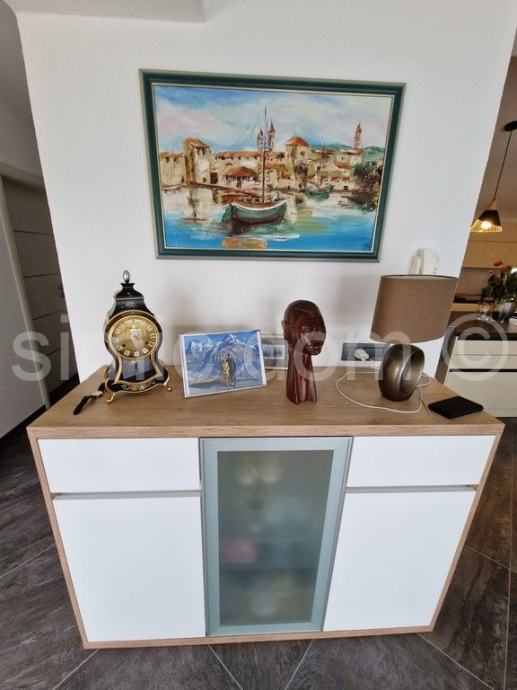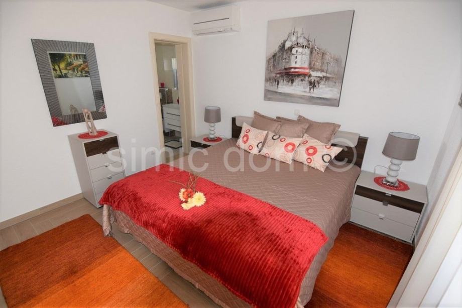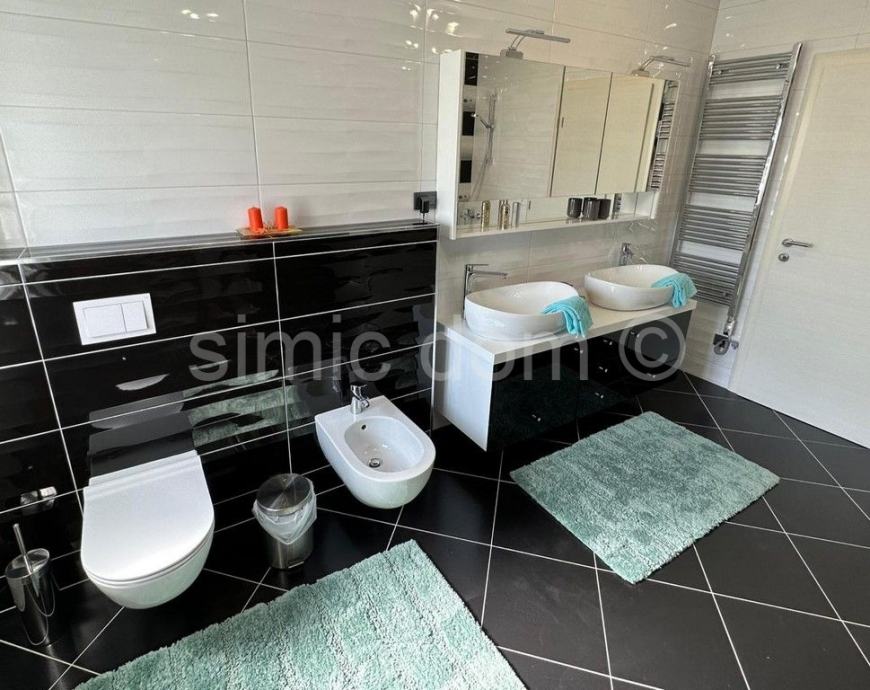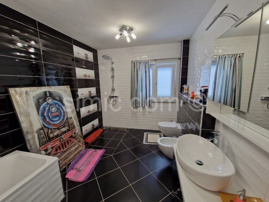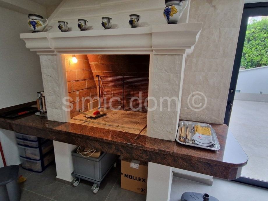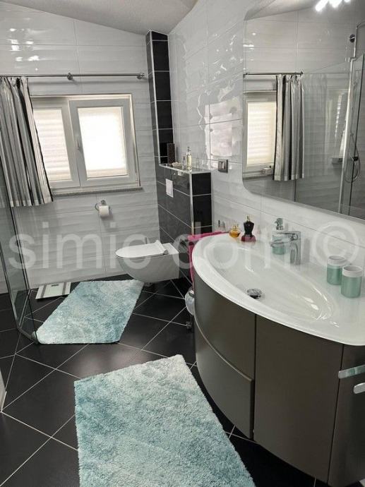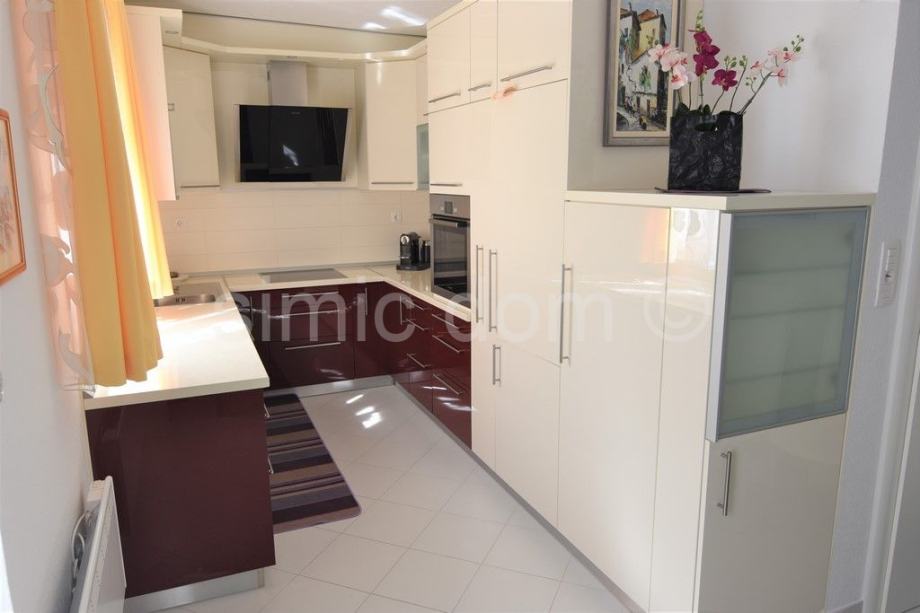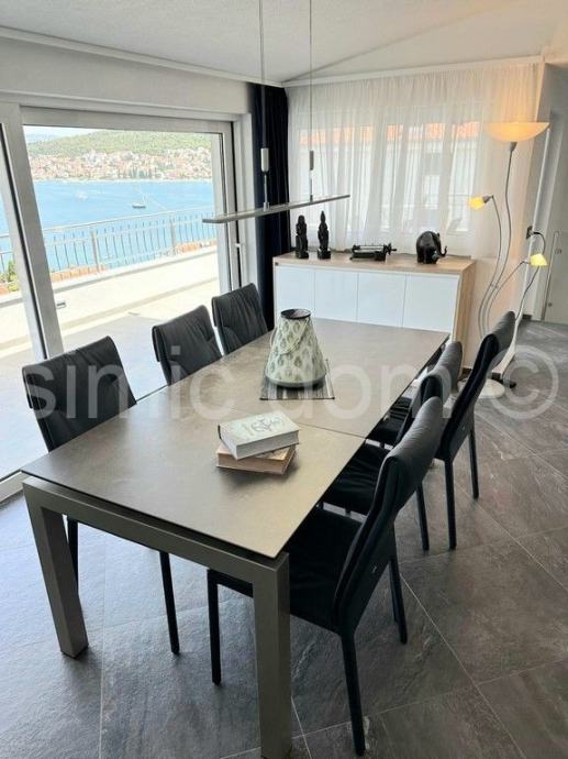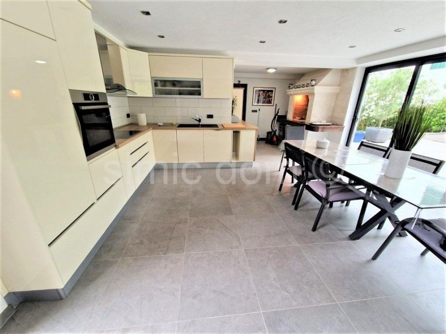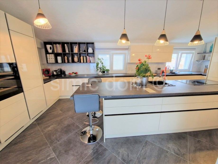 Na prodaju je predivna samostojeća kuća sa vrhunski opremljena i namještena tri stana, samo 150m od mora i blizu svih sadržaja. Kuća je kompletno renovirana prije nekoliko godina i ima ukupnu neto površinu od 608m2, odnosno 690,51m2 bruto. Kuća se proteže na 4 etaže. U suterenu površine 120m2 nalazi se garaža, kupaonica te veća i manja ostava. U prizemnom dijelu nalazi se veliki apartman od 135m2 neto površine. Apartman ima hodnik, dvije spavaće sobe, čak tri kupaonice, veliku terasu i prelijepi veliki uređeni prostor koji funkcionira kao ljetna kuhinja sa kaminom. Na prvom katu kuće nalazi se apartman od oko 80m2 neto površine sa dvije spavaće sobe, dvije kupaonice te velike kuhinje sa blagovaonicom i dnevnim dijelom, kao i terasa. Na drugom katu kuće nalazi se dvoetažni veliki apartman sa spektakularnim panoramskim pogledom. Apartman ima površinu od preko 230m2 neto. Sastoji se na gornjoj etaži od predsoblja, velikog dnevnog dijela sa blagovaonicom, velike moderne kuhinje kupaonice, spavaće sobe, ostave te velike terase. Stepenište vodi na donju etažu – koja je u razini prvog kata, a tu su još jedna kupaonica, radna soba te spavaća soba. Okućnica ima predivan vrt te uz prostranu garažu postoje i vanjska parkirna mjesta za još tri automobila. Ovu nekretninu krase zaista velike prostorije, otvoreni koncept, moderan dizajn te vrhunska oprema i materijali u svim apartmanima. Odličan je potencijal za već uhodano iznajmljivanje, ali i za življenje za veće obitelji. Vlasništvo uredno.