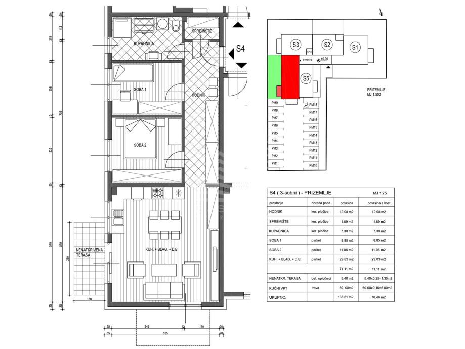 Stan oznake S04, trosoban, nalazi se u prizemlju te se sastoji od: ulaza, hodnika, kupaonice, sobe1, sobe2, dnevnog boravka sa kuhinjom i blagovaonicom, ukupne stambene površine 71,11m2, te terase od 5,40m2, vrta od 60m2 i vanjskog parkirnog mjesta od 12,50m2. Ukupna prodajna površina je 81,59m2.