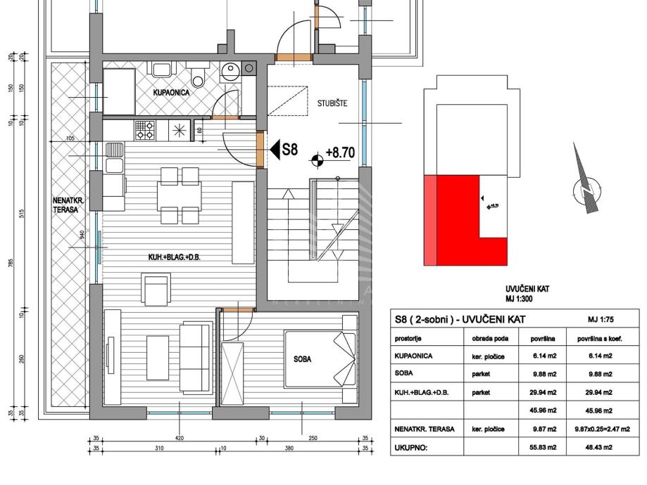 Stan oznake S8, dvosoban penthouse, nalazi se na 3. katu te se sastoji od: ulaza, dnevnog boravka sa kuhinjom i blagovaonicom, kupaonice, sobe. Ukupne stambene površine 45,96m2, te terase od 9,87m2 (obračunski 2,47m2) i vanjskog parkirnog mjesta od 12,5m2 (obračunski 3,13m2). Ukupna prodajna površina je 51,55 m2.
