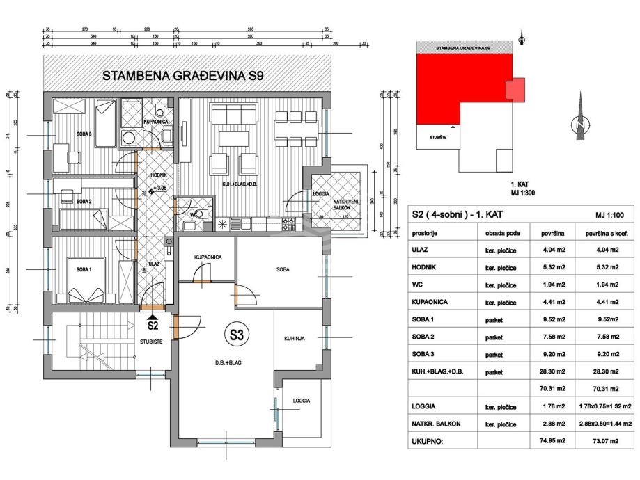 Stan oznake S2, četverosoban, nalazi se na 1. katu te se sastoji od: ulaza (4,04m2), hodnika (5,32m2), wc-a (1,94m2), dnevnog boravka sa kuhinjom i blagovaonicom (28,30m2), kupaonice (4,41m2), sobe1 (9,52m2), sobe2 (7,58m2), sobe3 (9,20m2), ukupne stambene površine 70,31m2, te balkona/lođe od 4,64m2 (obračunski 2,76m2) i duple garaže od 31,20m2 (obračunski 18,72m2). Ukupna prodajna površina je 91,79m2.