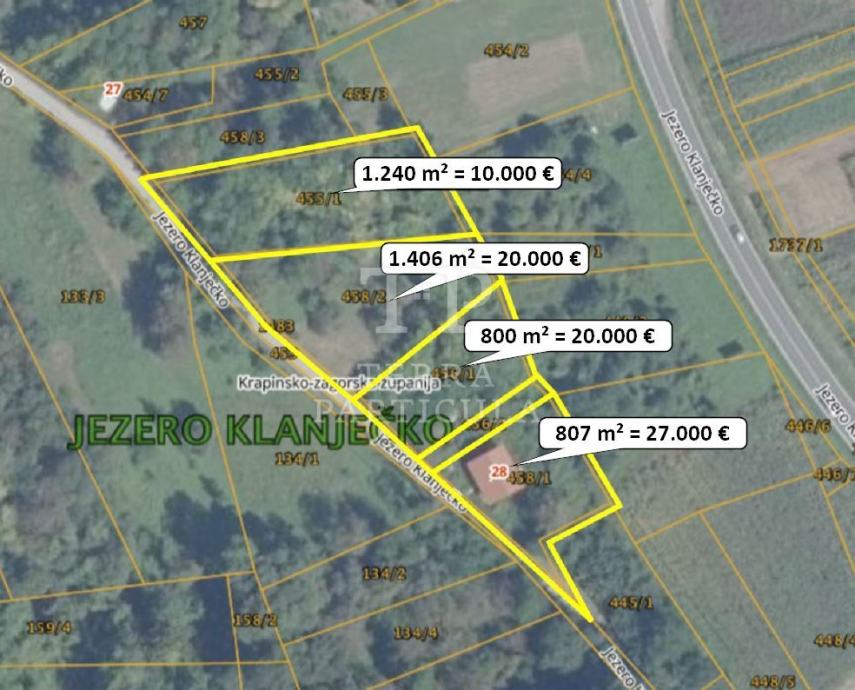 Na prodaju su tri građevinska zemljišta. Površine su im 1.241 m², 800 m² i 1.406 m². Nalaze se uz kuću u gradnji na adresi Jezero Klanječko 28, Veliko Trgovišće pri asfaltiranoj cesti uz koju su svi priključci. Iskazana cijena je za zemljište k.č.br. 455/1.