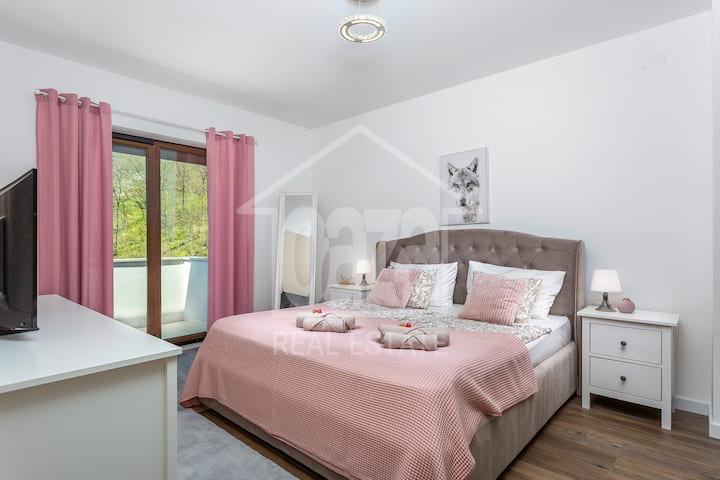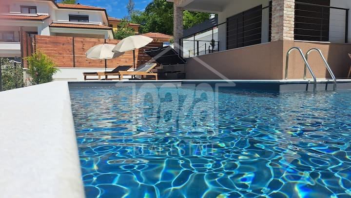 Veprinac, u zelenilu i tišini je smještena ova moderna i lijepa vila, uređena kao dvojni objekt.