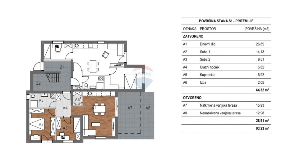 Stan čini ulazni hodnik (5,88 M2), prostrani open-space dnevni boravak s kuhinjom i blagovaonicom (26,89 m²), koji se nastavlja na djelomično natkrivenu terasu (28,91 m²) – savršenu za opušteni boravak na otvorenom i obiteljska druženja, dvije spavaće sobe – veću (14,13 m²) i manju (9,51 m²), moderno uređenu kupaonicu (5,92 m²) i ostavu (2,05 m2).
