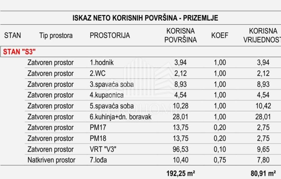 Bruto površina stana je 192,25 m2, a ukupna obračunska neto površina stana s pripadcima iznosi 80,91 m2.