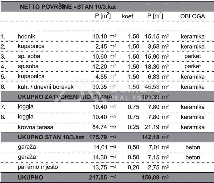 Stanu pripadaju i dvije loggie površine 2x10,40 m2 i prekrasna krovna terasa 84,74 m2, i dva garažna parkirna mjesta 2 x 14,30 m2.