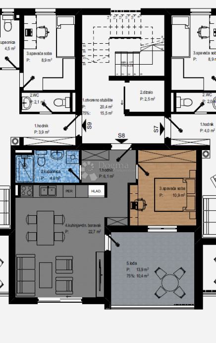 Na Vidikovcu u vrhunskoj gradnji gradi se zgrada sa 9 stanova. Penthouse oznake S8 smješten je na drugom katu zgrade sa vlastitom krovnom terasom, jugozapadno orijentiran.