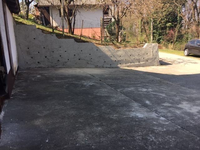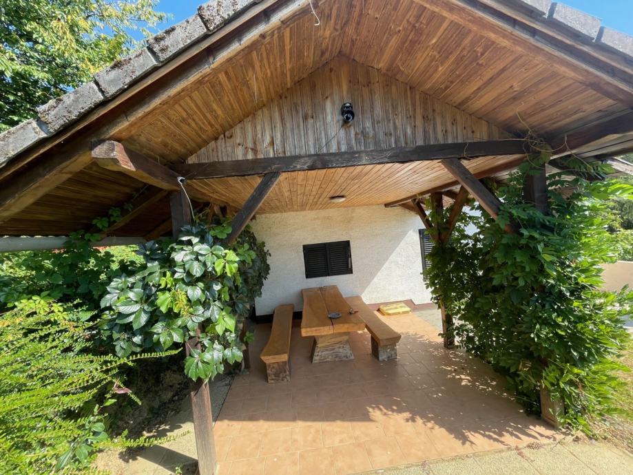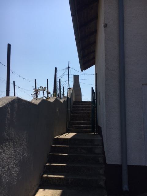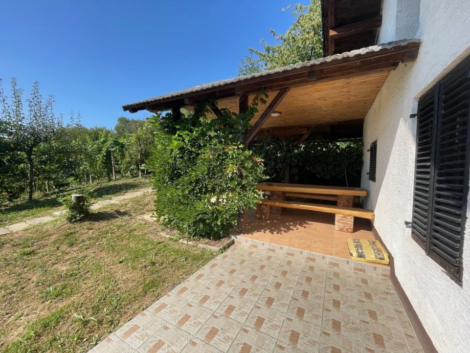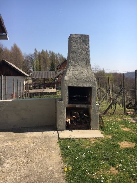 Vanjskim stepenicama dolazi se do gornjeg dijela kuće gdje se nalazi roštilj, lijepa velika natkrivena terasa, te okućnica sa vinogradom i voćkama.