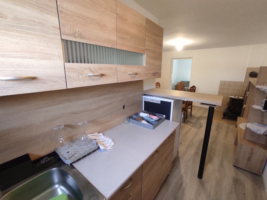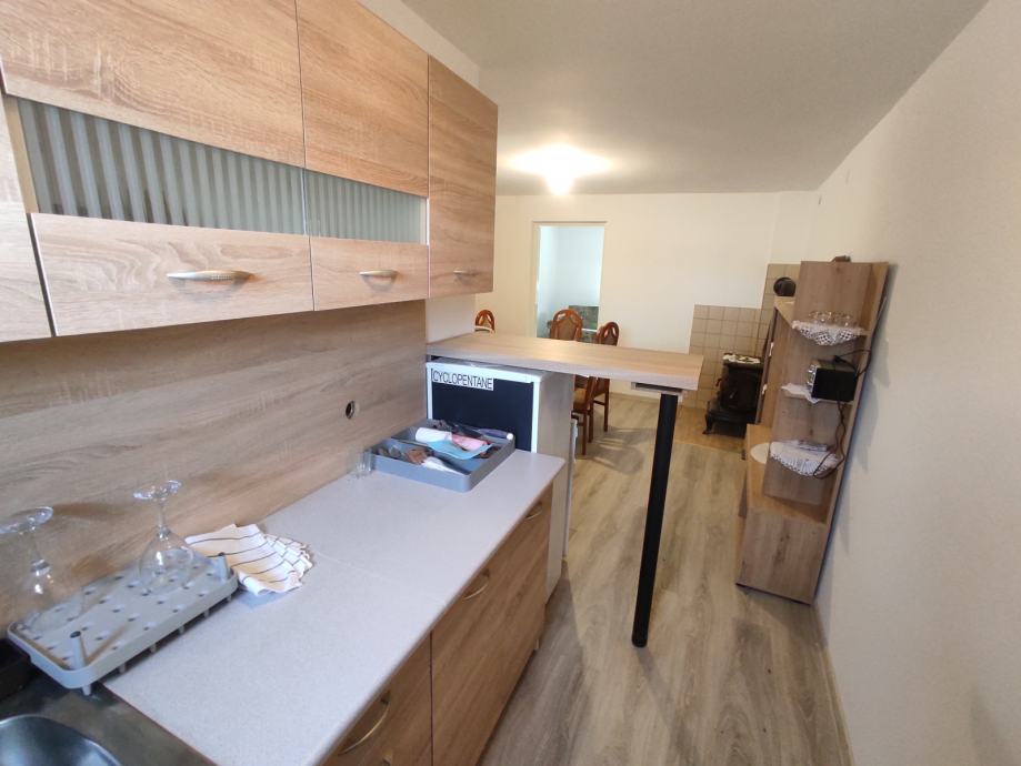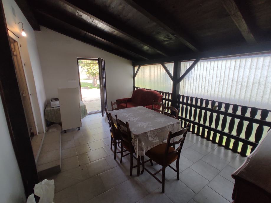 Stambeni prostor se sastoji od prostranog ulaznog hola (natkrivene i zatvorene terase), kuhinje sa blagovaonicom / dnevnim boravkom te 2 sobe i uređenom kupaonicom. Uz natkrivenu terasu nalazi se i spremište, a ispred nekretnine nalazi se dovoljno prostora za smještaj roštilja i druženje na otvorenom.