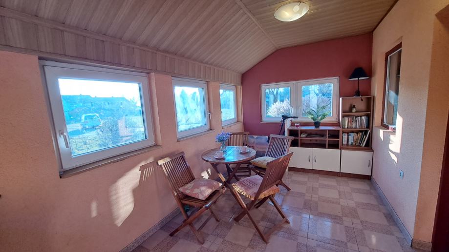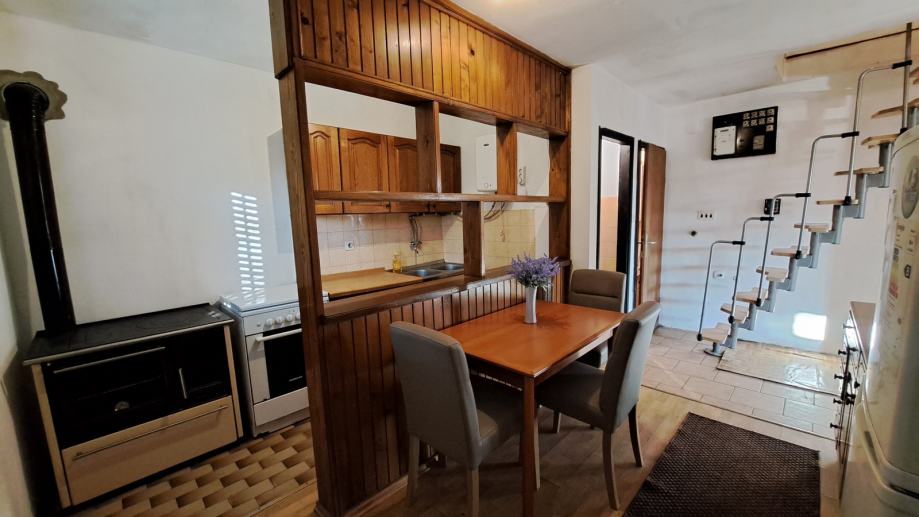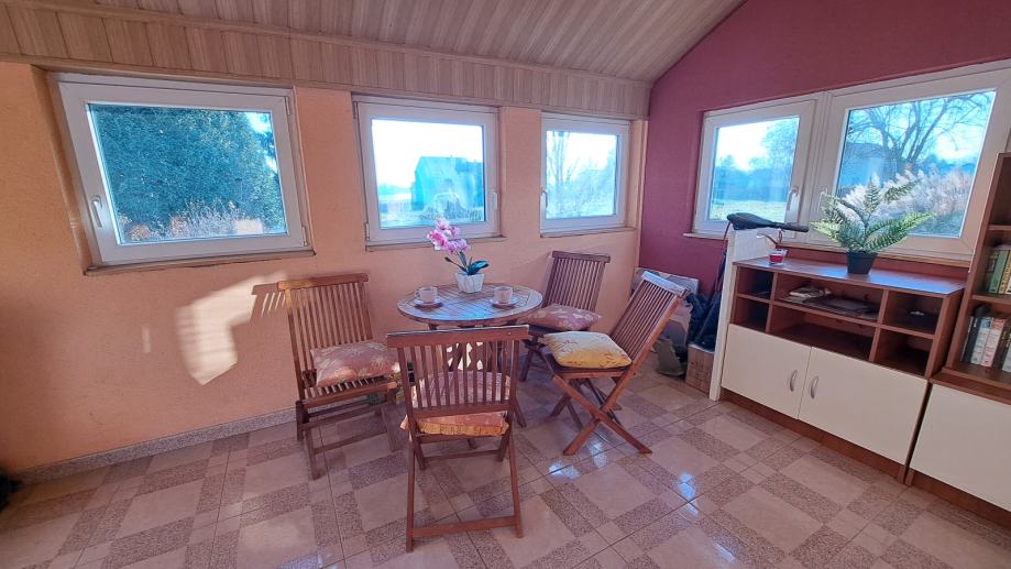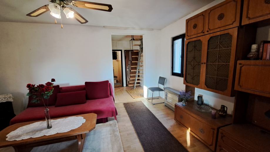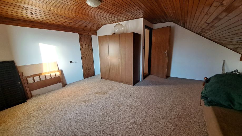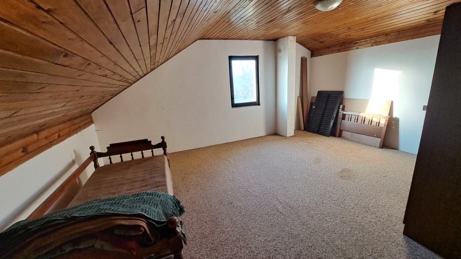 U potkrovlju se nalazi prostrana spavaća soba i malo spremište koje je moguće urediti u walk in ormar. Iza kuće je novo napravljena i legalizirana dodatna prostorija koja je zamišljena kao prošireni prostor za veću kupaonicu i kuhinju. Također se u nastavku nalazi drveno spremište za drva.