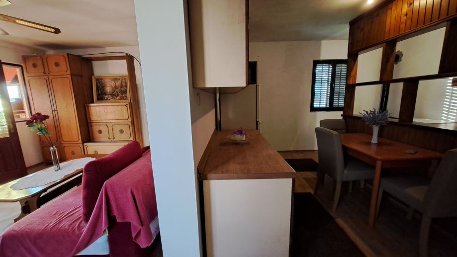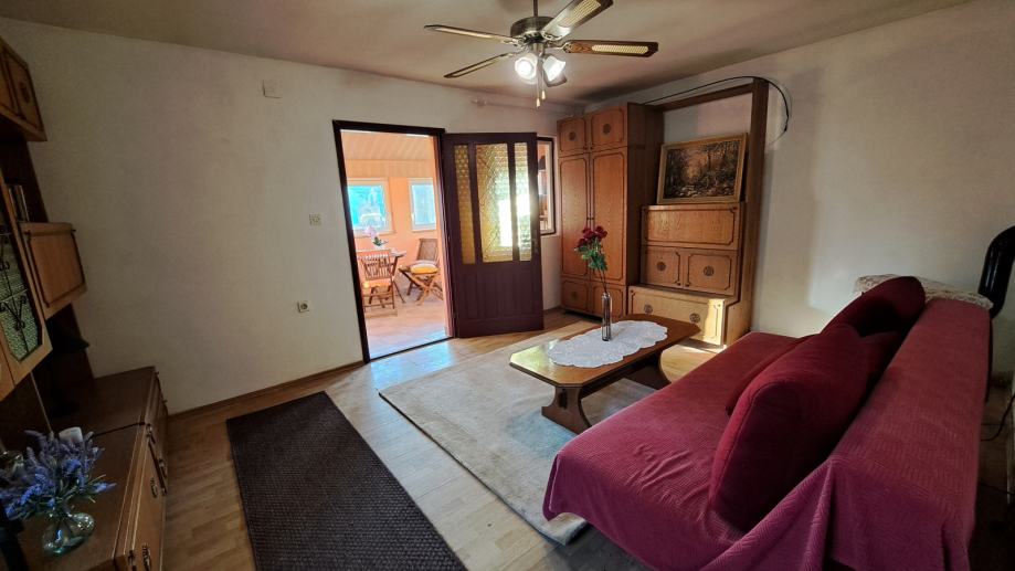 U prizemlju vikendice nalaze se prekrasna, svijetla, zatvorena terasa (PVC stolarija), dnevni boravak, blagavaonica i kuhinja sa šankom, kupaonica sa tuš kabinom i odvojeni sanitarni čvor te stepenište za potkrovlje.