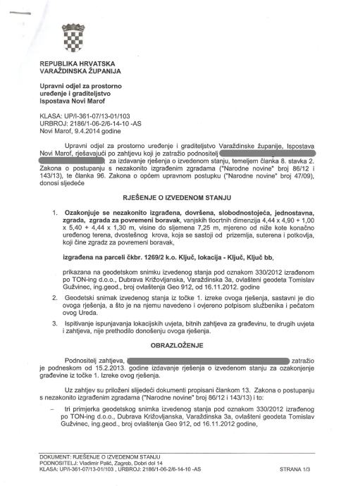 Novi Marof selo Ključ, zidana vikendica 50 m2 na zemljištu 800 m2. Prekrasna priroda i mir, samo 2km od izlaza sa autoceste Zagreb-Goričan. Struja i voda na zemljištu. Objekt je legaliziran (u priloženim fotografijama je rješenje o izvedenom stanju). Rješenje o izvedenom stanju (legalizacija objekta), zamjenjuje građevinsku i uporabnu dozvolu.