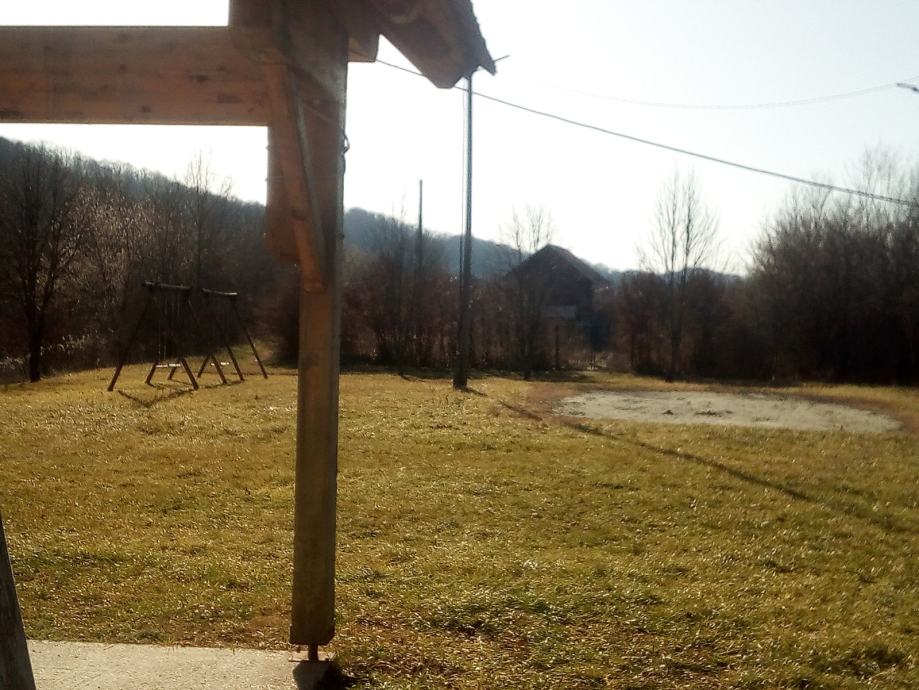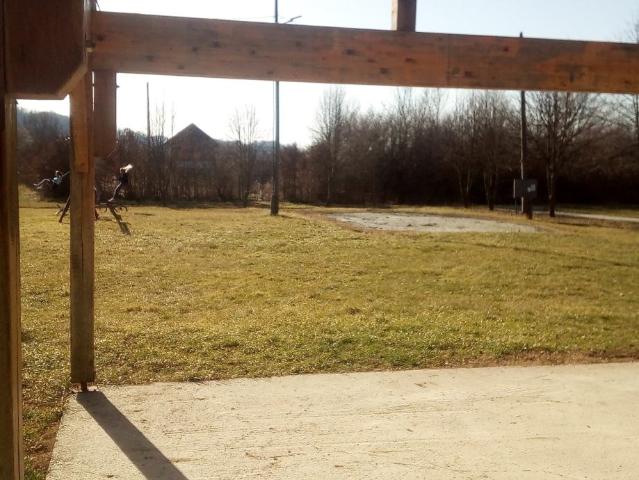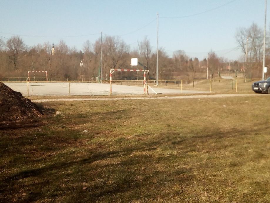 Ispred parcele, kupalište,plaža,nogometno igralište.