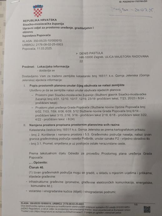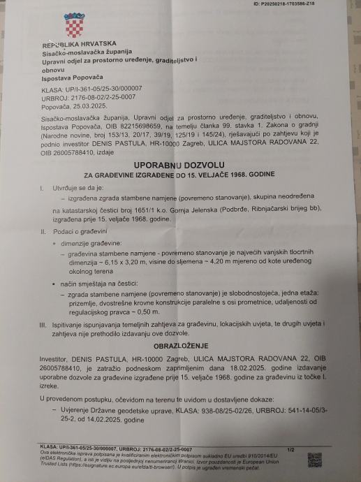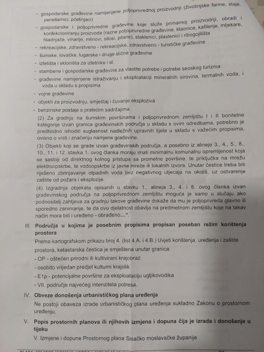Parcela se nalazi unutar zone vrijednog obradivog tla P2,ali budući da kuća posjeduje uporabnu dozvolu za građevine izgrađene prije 1968., parcela je u kategoriji građevinskog zemljišta te je uz dopunu dokumentacije, dozvoljena gradnje nove nekretnine.