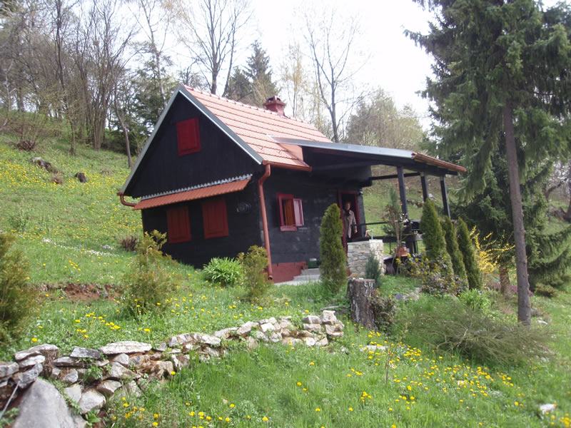 mala drvena kuća u zelenilu, lijepa okućnica i terasa, lijep pogled, struja, voda