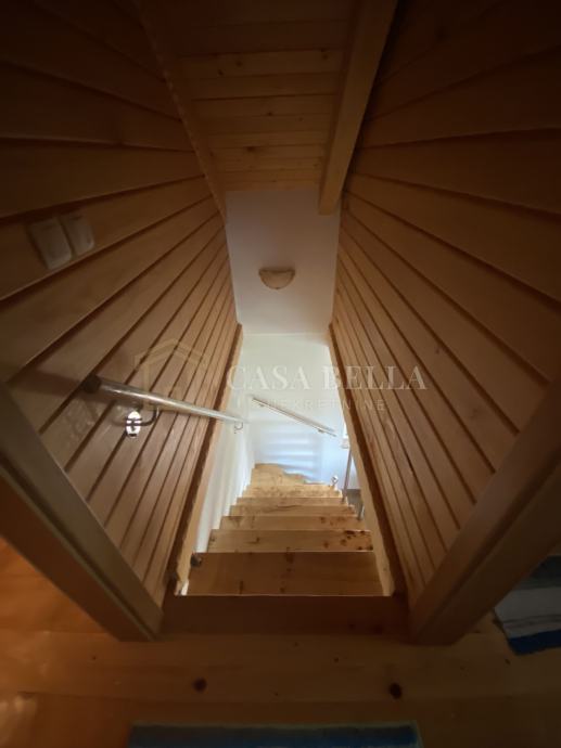 U prizemlju se nalazi kupaonica, kuhinja sa dnevnim boravkom koji ima izlaz na balkon sa drvenim podom od krasnog ruskog ariša . Drvene stepenice vode do potkrovlja koje čini dvije spavaće sobe.